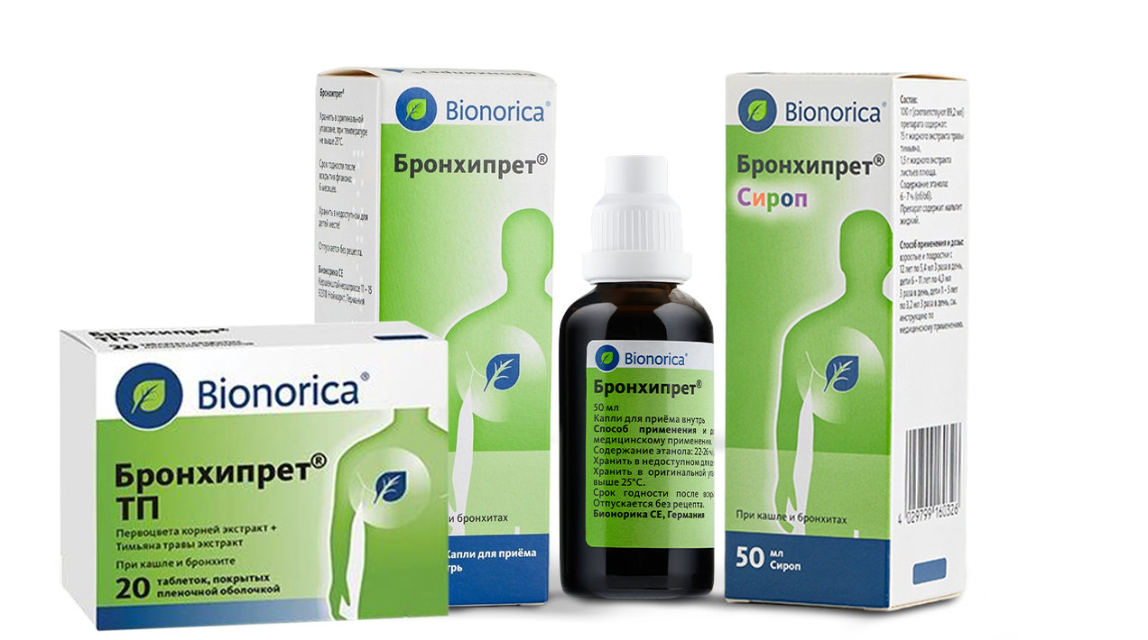 Растительный лекарственный препарат Бронхипрет® разработан для лечения кашля у взрослых и детей от 1 года*. Были учтены возрастные особенности кашля и создана оптимальная формула для уменьшения воспаления в дыхательных путях при кашле. Бронхипрет® подтвердил свое лечебное действие в ряде клинических исследований и успешно применяется для лечения острого и затяжного кашля.