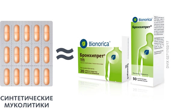 Бронхипрет® обладает сравнимой эффективностью с синтетическими отхаркивающими препаратами, такими как амброксол и ацетилцистеин. При этом лечение препаратом Бронхипрет® лучше переносится пациентами и вызывает меньше побочных реакций. Эти свойства препарата Бронхипрет® были изучены в большом немецком сравнительном исследовании, проведенном в условиях реальной клинической практики с участием более чем 7000 пациентов как взрослых так и детей с острым бронхитом. Все пациенты были разделены на 3 основные группы по типу принимаемого отхаркивающего препарата: Группа 1 – Бронхипрет®, Группа 2 – амброксол и Группа 3 – ацетилцистеин. Все пациенты принимали назначенные препараты в течение 10 дней. После сложного статистического анализа, основанного на оценке относительных шансов успеха лечения, было показано преимущество препарата Бронхипрет®, по сравнению с амброксолом и ацетилцистеином, в снижении интенсивности кашля днем, выраженности кашля ночью, болезненности кашля, а также наличия хрипов. При этом применение препарата Бронхипрет®, как единственного лекарства, так и с другими препаратами, имело меньшее в разы количество побочных эффектов.